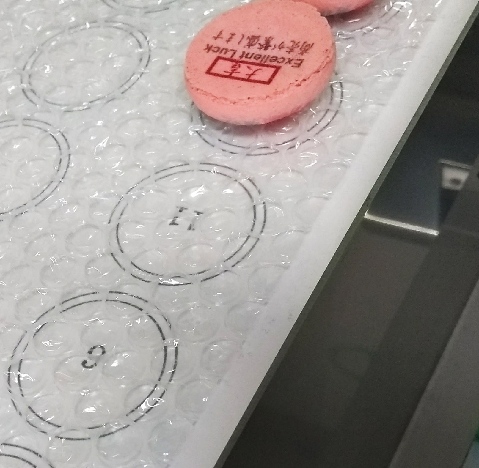 ※写真は裏面をプリントしているところ。エアクッションは丸いマカロンのオモテ面が動かないように敷いています。